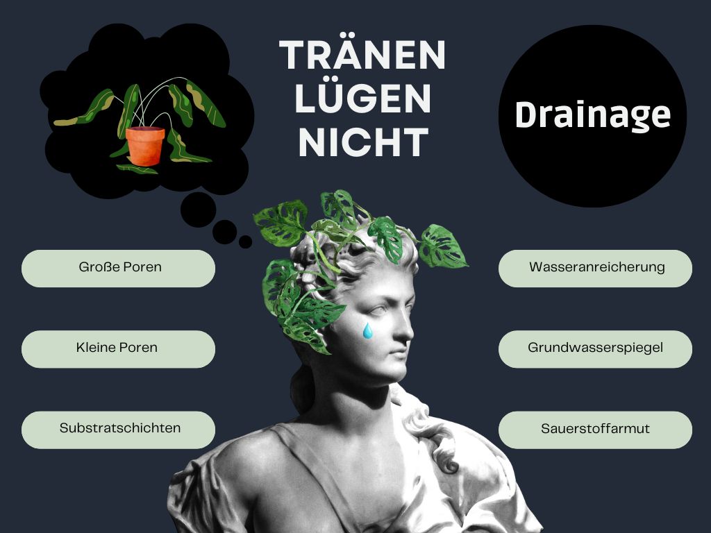 Da klingt der oft und gerne gegebene Ratschlag einer Drainageschicht erst einmal logisch: Grobe Materialen lassen Wasser abfließen und schützen so deine Pflanze. Du haust also Pon, Tonscherben oder irgendwelche Kieselsteinchen in den Blumentopf, klatschst Blumenerde darüber und Ta-Da, das Wasser fließt ungehindert durch den Topf.